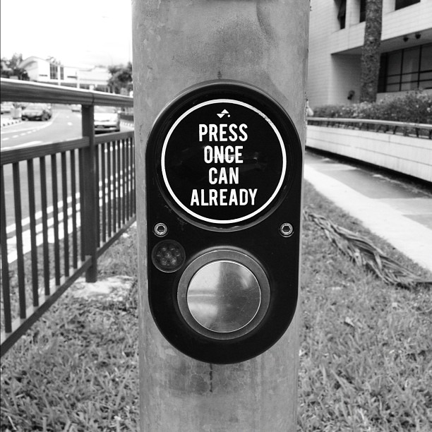 “Much of the Beauty that arises in art comes from the struggle an artist wages with his limited medium,” Henri Matisse said. The genius of Sticker Lady’s work is that she adroitly treads the line between humour and inconvenience. Like all great street art, her little messages create inner dialogues between passers-by and hitherto inconspicuous public spaces. They force us to take pause and question the subconscious actions the urban madness breeds—“Will pumping the button twice really let you cross the road faster?”
