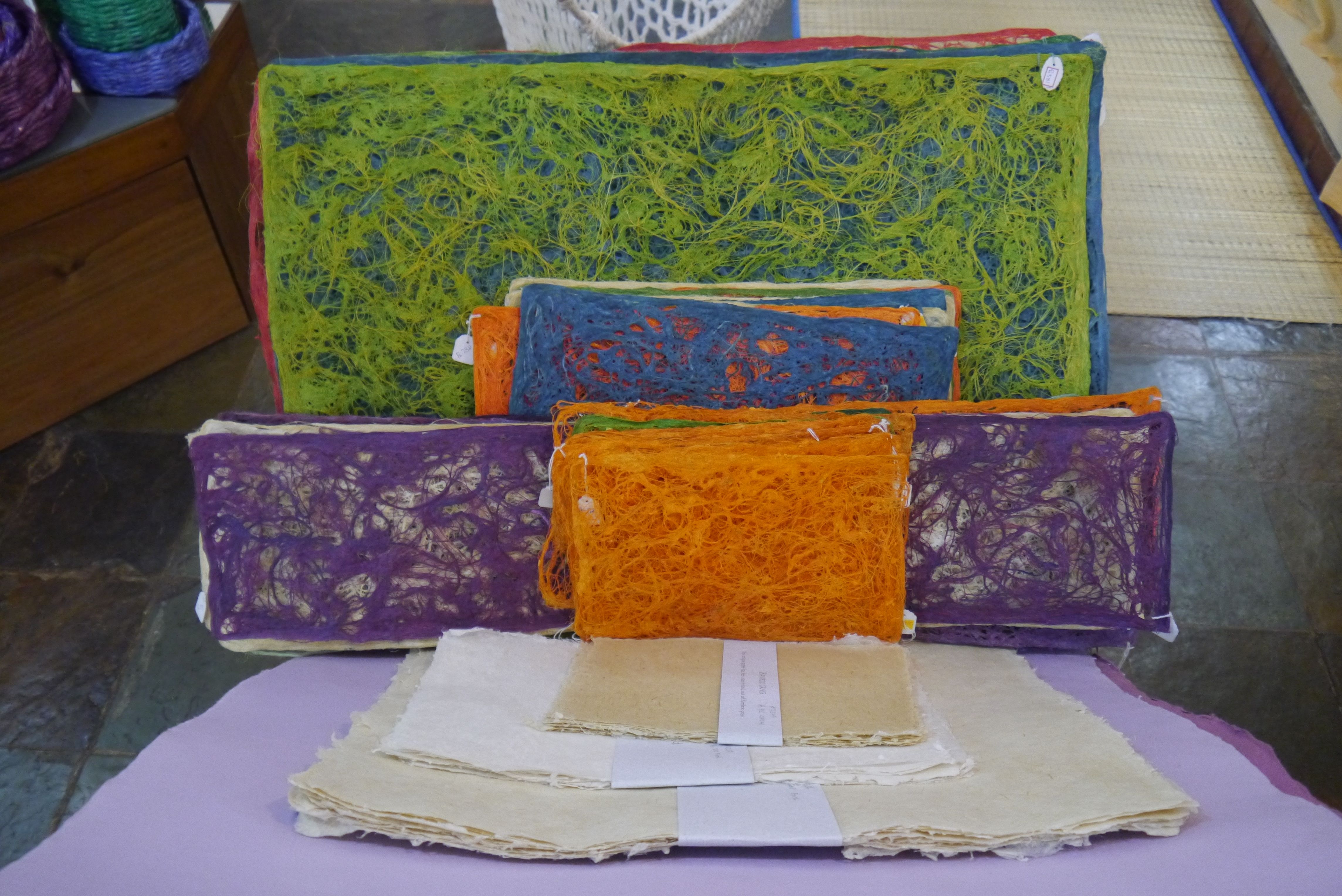 After attending college in Bangalore, Supriya moved to Pondy—and eventually Auroville—in the 1990s in a bid to immerse herself in art. She eventually became a potter. Kirit and I are there on the eve of her departure for a five-week collaborative pottery workshop with Koreans in Busan, South Korea. As part of her last-minute packing, she is scurrying around for Indian tea, not wanting to take any chances with the East Asian varietals, and for spices, with which to cook for her hosts. As gifts, Supriya is also keen to pick out some Aurovillian handicrafts–the produce of this artistan community is quite impressive (paper products, including several kinds of paper made with banana leaf, and papyrus, pictured).