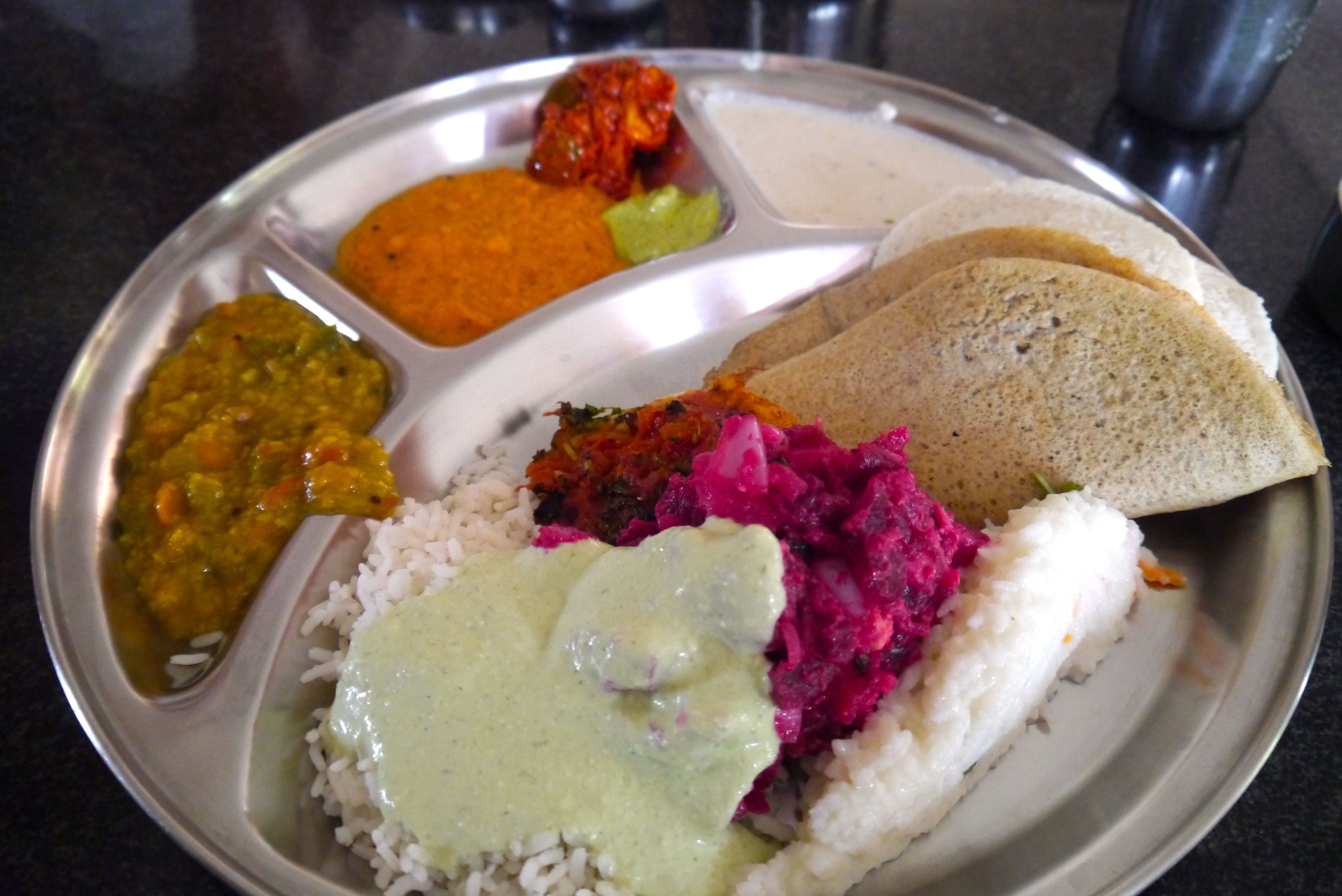 The other bias I have, of course, is around food. Supriya takes Kirit and I to the Solar Kitchen, where we have one of the most mind-blowing vegetarian meals of the trip (pictured–the brown bread is thosai made with a special kind of grain, the name of which I forget). This being Auroville, it bears mention that by “mind-blowing” I am referring only to legal, fresh, organic produce, almost all grown locally. In India you might hear a carnivore’s omnivore, like myself, conceding that vegetarianism is possible if only the food is always this good—well, coming second only to my Nani’s Kitchen in Indore is the Solar Kitchen in Auroville. Yum.