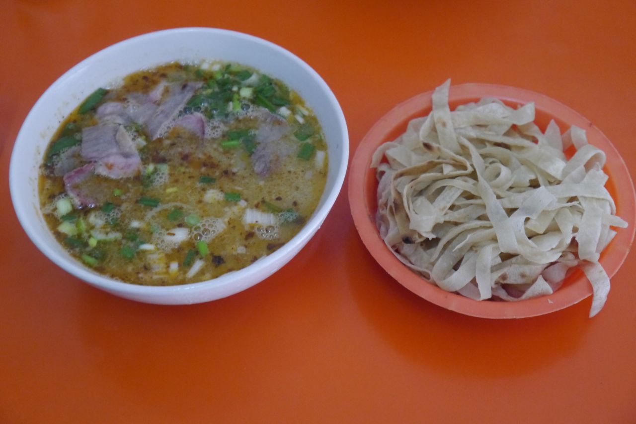 This is a variant on Xi’an’s yang rou pao mo. Lamb broth with shreds of unleavened bread. Dip the bread, and slurp like noodles.